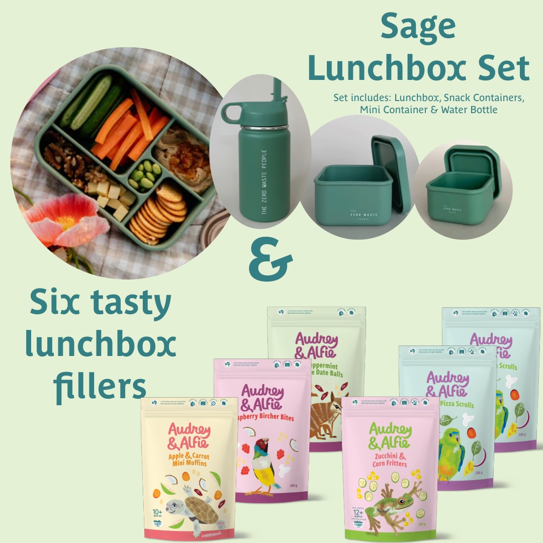 Our limited-edition Back to School/Kinder bundle comes with our Sage Bento Lunchbox, and matching Water Bottle, Snack and Mini Containers. These eco-friendly silicone lunchboxes are perfect for little people and grown-ups alike.