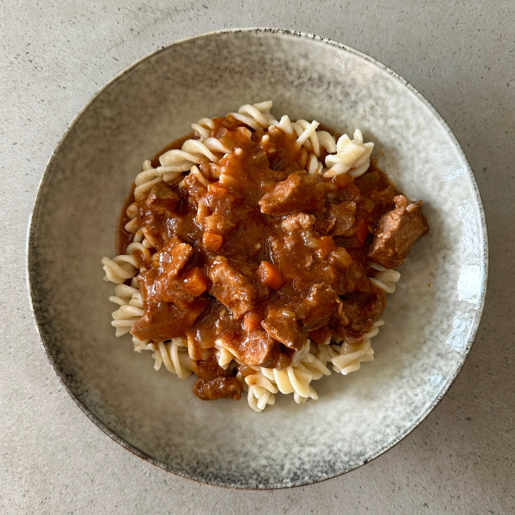Water (27%), grass-fed beef (21%), passata (21%), red wine (sulphites) (8%), onion (5%), carrot, celery, tapioca flour, extra virgin olive oil, vegetable stock (salt, corn flour, sugar, extra virgin olive oil, parsley, turmeric, celery, tomato, onion, garlic, pepper, nutmeg), garlic, bay leaf, salt, pepper. Contains: sulphites.